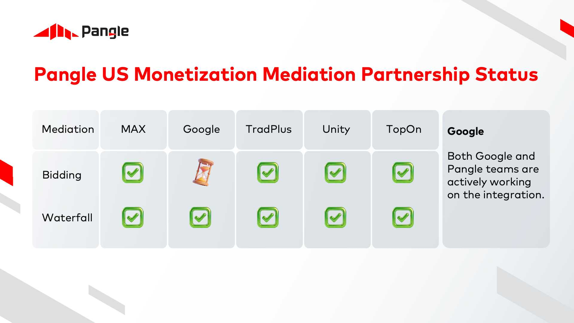 Pangle ad monetization services are now available in the US, bringing the platform to one of the most dynamic mobile markets in the world. We’re here to support app developers and advertisers thinking about their next phase of growth with US audiences.