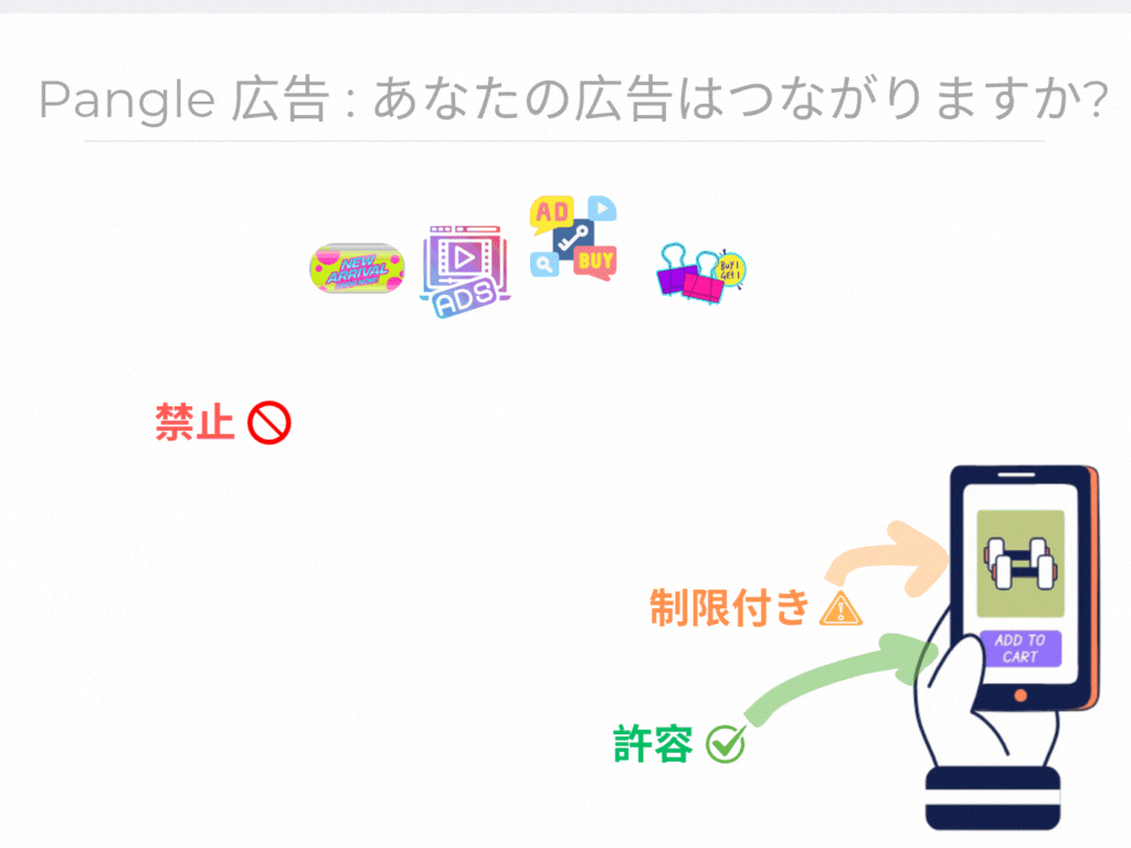 当社の広告ポリシーは広告主向けの総合ガイドとしての役割を果たし、当社のプラットフォームで広告を配信する上で満たすべき基準を詳述しています。どのようなコンテンツが禁止、制限(条件付きで許可)、または完全に許可されているかを明確に説明し、曖昧な点がないようにしています。当社のポリシーやモデレーションの方法は時とともに進化する可能性があるため、法的な変更、社会的要請、およびユーザーからのフィードバックに沿うように、私たちは定期的にガイドラインを更新しています。当社プラットフォームでの広告運用を成功させるために、ぜひガイドラインをご確認ください。Pangleのコミュニティにご参加いただき、ありがとうございます。