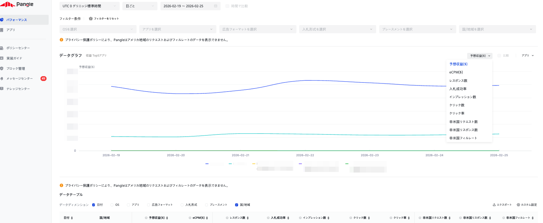 * ポリシーの規定により、Pangleのレポートにアメリカの広告リクエストデータは含まれません。代わりに「リクエスト(アメリカを除く)」を提供することで、他の国 / 地域のフィルレートを正確に計算できるようにしています。