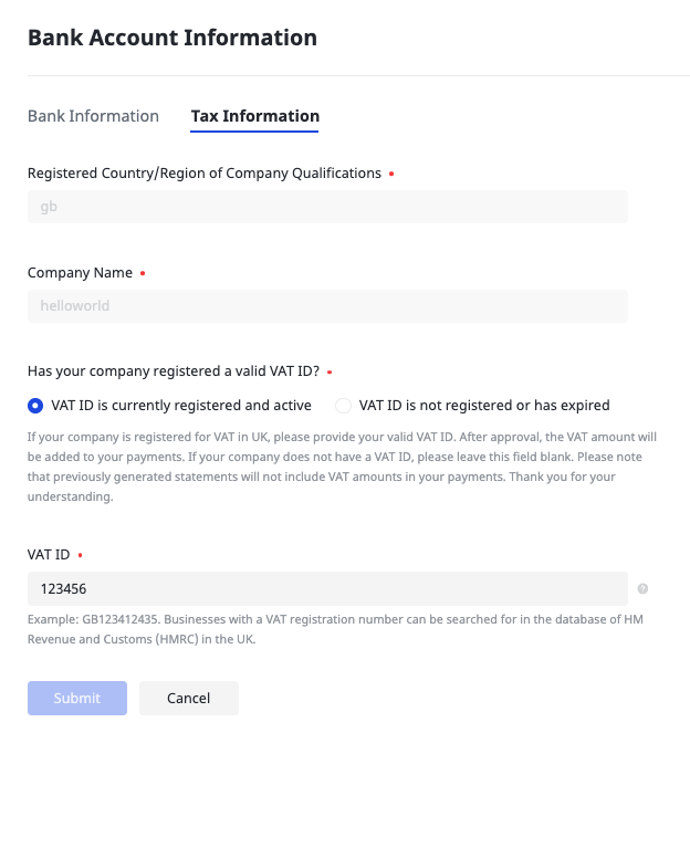 United Kingdom of Great Britain and Northern Ireland (the) | Value Added Tax Number (GB) | GB + 9 digits | GB 123456789 |