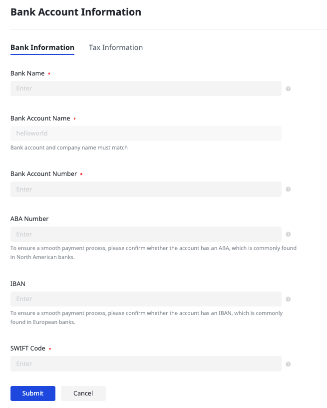 - The payment information must be filled out in English. Your company name will be used as your bank account name. If you do not have a bank account name in English, you may apply for a foreign currency account with your bank and receive English information of your bank account from your bank