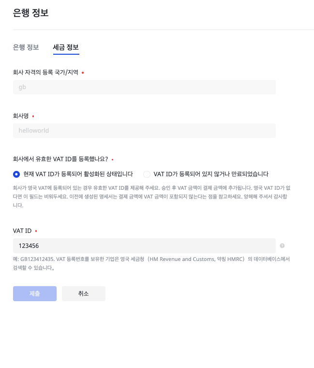 한국 | 부가가치세 번호(KR) | 10자리 숫자 | 123-45-12345 |