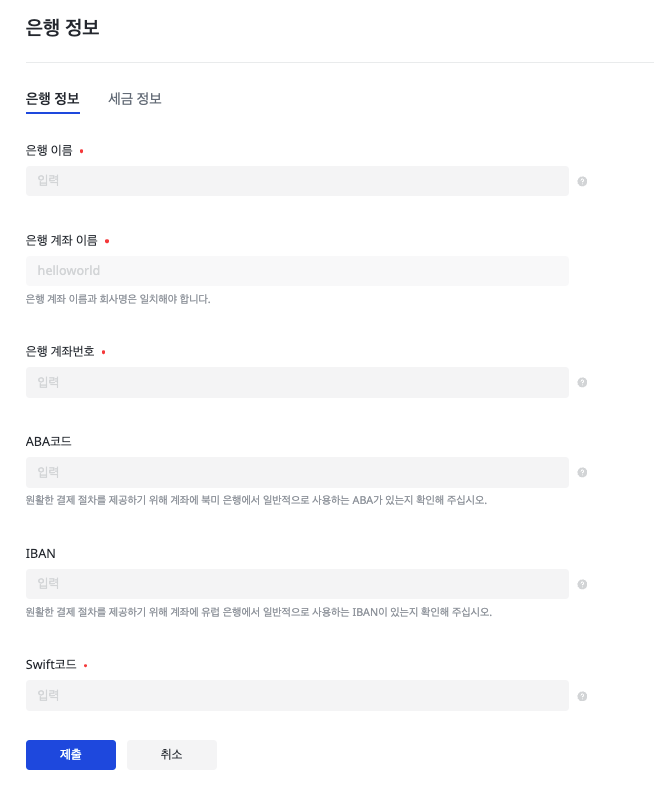 은행 계좌 이름과 회사명은 일치해야 합니다.
