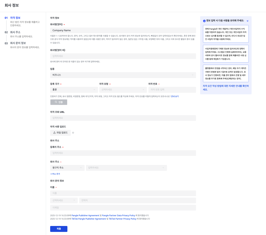 회사 정보를 편집하는 방법에 대한 자주 묻는 질문은 다음 링크를 참조하세요. https://www.pangleglobal.com/knowledge/edit-company-info