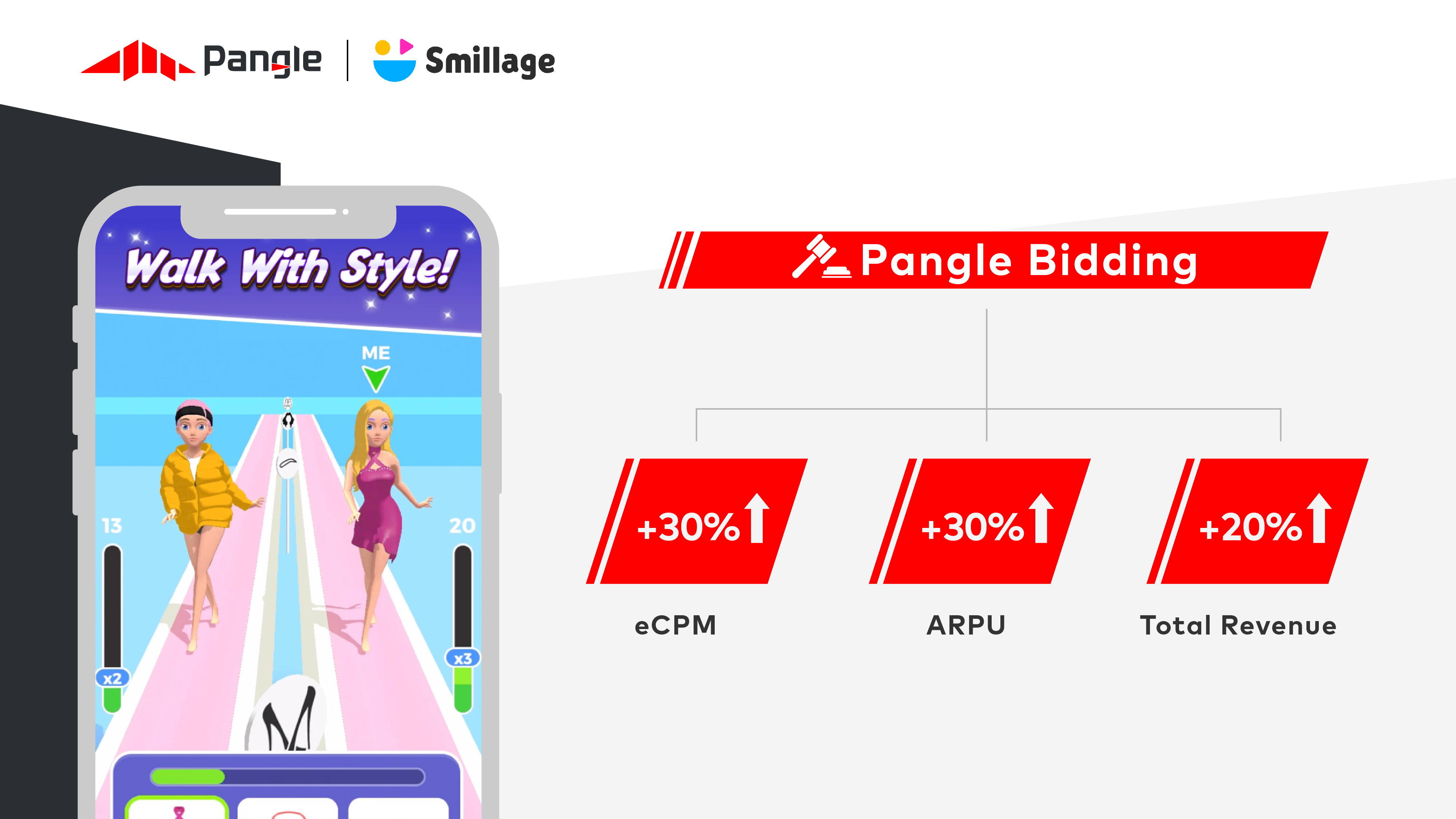 Smillage는 Pangle 입찰 덕분에 활동하는 모든 지역에서 더 높은 eCPM을 달성했으며, ARPU가 30% 증가하고 LTV가 개선되었습니다. Pangle은 수익 창출의 최대 30%에 기여했으며 무엇보다도 총수익이 20%나 증가했습니다.